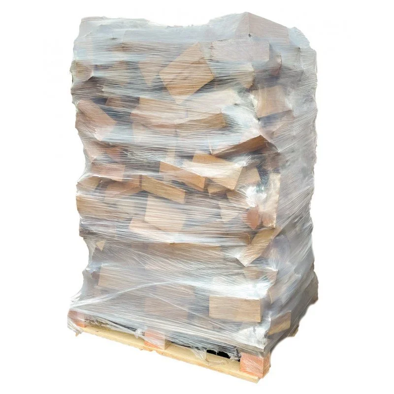 Bois de chauffage Sec en vrac sur une palette perdue et filmée, pratique et économique. Humidité du bois contrôlée lors du séchage, garantie inférieure à 20%, pour un rendement maximum.