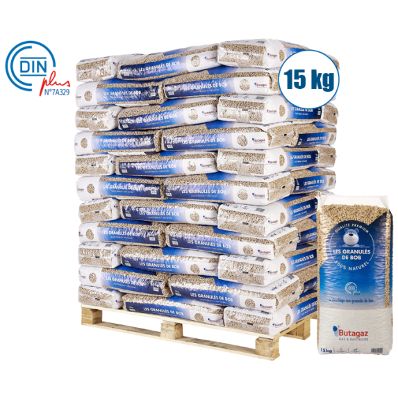 Conditionnée en sac de 15kg, la palette de granulés de bois pellets Butagaz en contient 66 sacs, soit un poids total d’environ une tonne (990kg exactement). Les dimensions de la palette de pellets en sacs de 15kg varient en fonction de la région : 80x120x180cm ou 100x100x180cm.